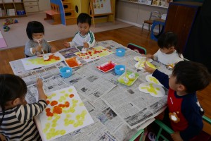 みかん組「落ち葉バッグ作りをしたよ」 今日は、絵の具を使って、落ち葉バッグに色を付けたよ。 黄色・橙色・赤色の絵の具を付けて、ポンポンとスタンプ。 きれいな色だね、これがりんごの形の落ち葉バッグになるよ。 お友だちと関わり合いながら、楽しく遊べるようになってきたね。