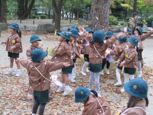 落ち葉拾いにお出かけしたよ! 11月19日(火)、中央公園へ落ち葉拾いに出かけました。 まずは、園長先生の話を聞いて出発です。 「車に気をつけ、たくさん落ち葉を見つけてね!」 「はーい(^O^)/ 行ってきます!!」 たくさんの落ち葉をみつけたよ 😀 「きれいだね!」 「いろんな形の落ち葉があるね!」 「黄色い葉っぱを見つけたよ!」 「大きい落ち葉もあったよ!!」 「たくさんあるよ!」 「歩いてみると、とってもすてきな音がするね 😉 」 「落ち葉シャワーだぁ~」 みんなできれいな落ち葉を見て、遊んで楽しかったね 😛