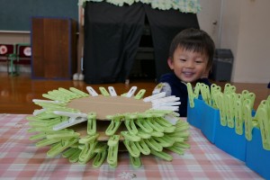 おやこであそぼう!「せんたくばさみであそぼう」 今日は、たくさんの洗濯ばさみで遊んだよ。 指先を上手に使って、洗濯ばさみを付けていったよ。 たこ、あおむし…いろいろできたね。 箱をつなげて列車の完成‼ 全部、ぼくがつけた洗濯ばさみだよ、と大満足の笑顔。 約30分間、集中して遊べたよ。楽しかったね。 次回、11月21日(木)も「せんたくばさみであそぼう」です。 12月10日(火)・12日(木)は、「クリスマスのかざりをつくろう」です。 参加お待ちしています。