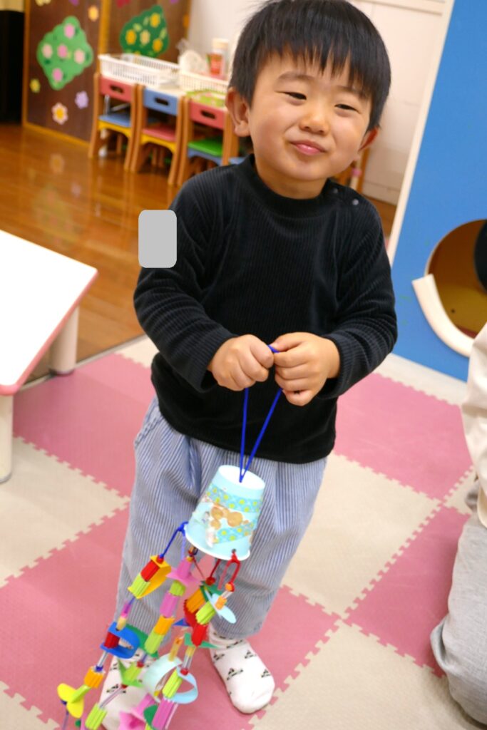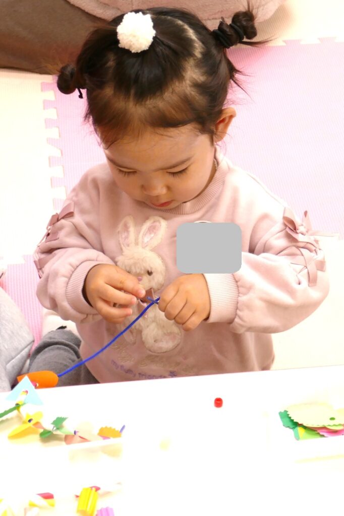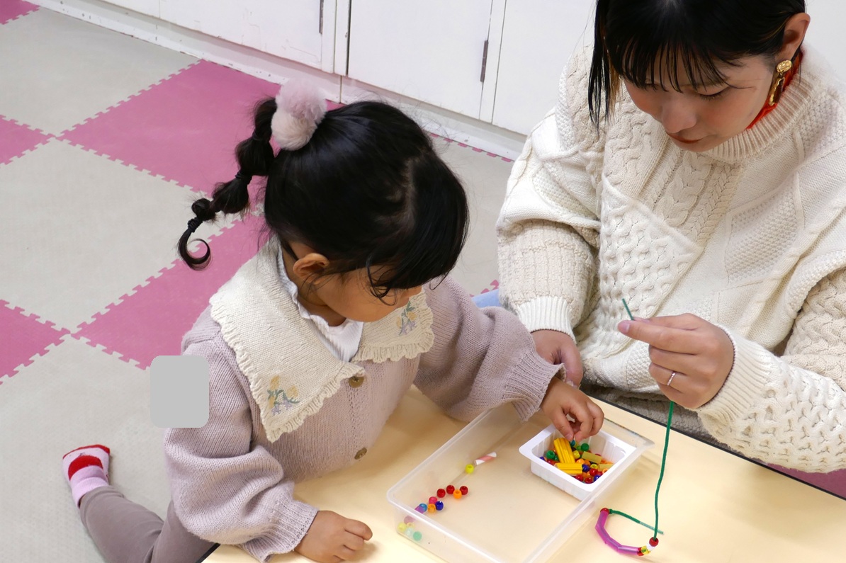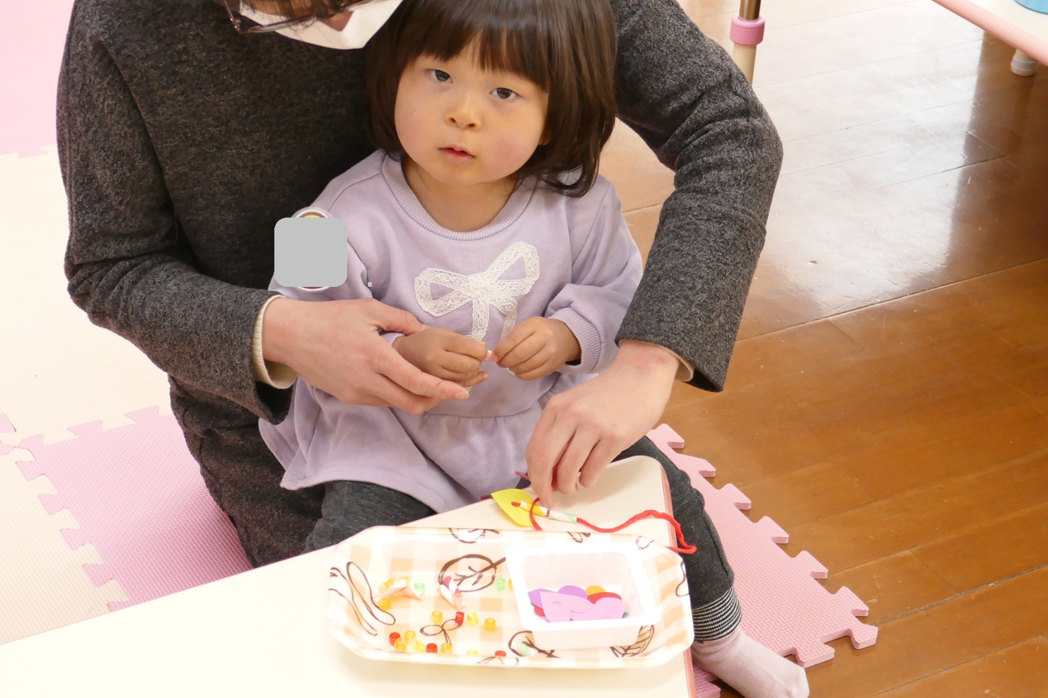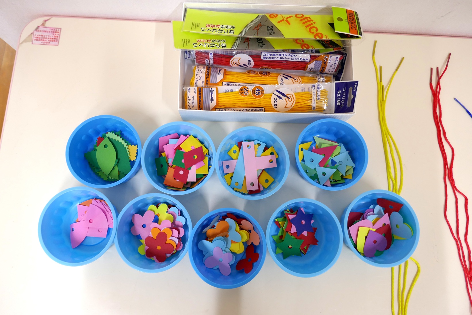 今週は、お家の人と一緒に、ひも通しをしたよ。