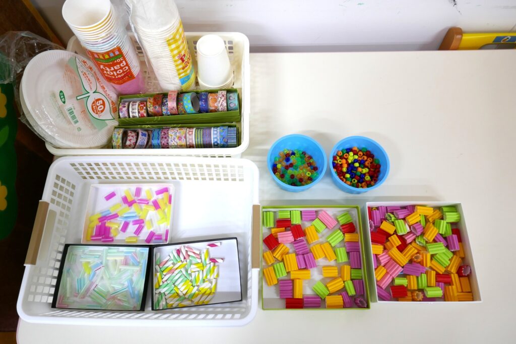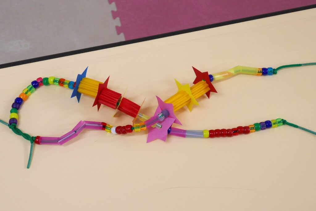 ビーズやストロー、かわいい形の紙の中から好きなものを選んで、綴り紐やモールに通していくよ。
